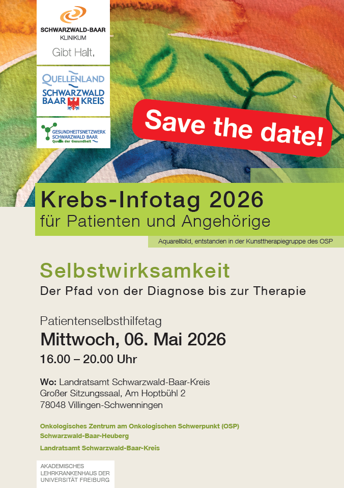 Am 06. Mai 2026 findet in den Räumlichkeiten des Landratsamtes Schwarzwald-Baar-Kreis der Krebs-Infotag statt. Ganz unter dem Motto "Selbstwirksamkeit - Der Pfad von der Diagnose bis zur Therapie" bietet dieser Tag eine Plattform für Patient:innen, Angehörige und Interessierte, um sich an Messeständen, Vorträgen und Workshops vielerlei Informationen einzuholen und ihre persönlichen Fragen zu stellen.